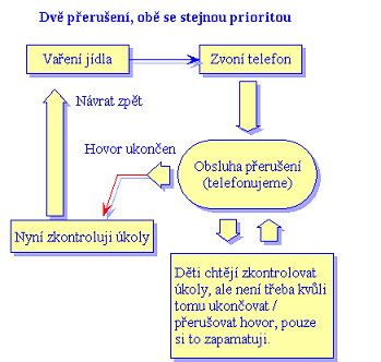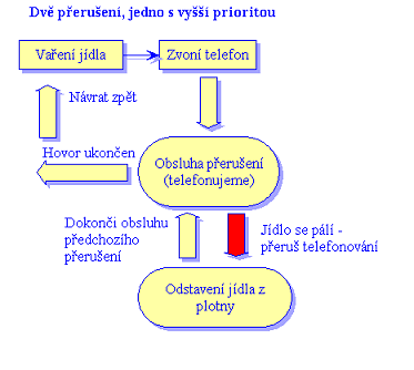 Nyní provádíte obsluhu přerušení - telefonujete. Hlavní program (vaření) byl přerušen zvoněním telefonu. Pokud je tohle jasné, budeme pokračovat. Procesor x51 má dvě úrovně priority přerušení - vyšší a nižší. Jaký je v tom rozdíl ?